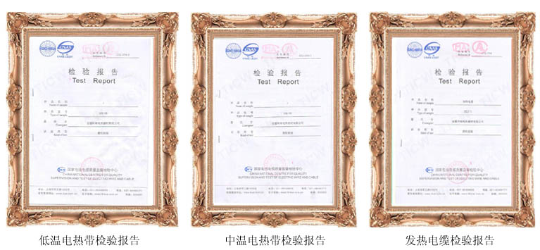 為了保證檢驗報告的權威性,時效性,針對性。我司電熱帶,發(fā)熱電纜產(chǎn)品選擇國家最權威的檢測機構-國家電線電纜質量檢測中心進行送檢。經(jīng)過三四個月的檢驗周期,目前我司已重新獲得低中溫自控溫電熱帶,發(fā)熱電纜國家電線電纜檢驗報告。所以產(chǎn)品質量均達到或優(yōu)于檢測標準,這是對我司近期生產(chǎn)的產(chǎn)品質量,包括原材料采購一重要評定。我司將陸續(xù)更新現(xiàn)有公司資質,做到與時俱進。