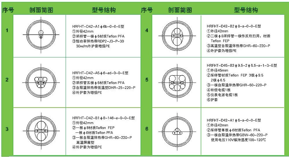 耐腐采樣伴熱復(fù)合管是環(huán)保監(jiān)測系統(tǒng)中的重要部件,它是由一組耐腐高性能樹脂導(dǎo)管輔以自限溫伴熱帶以及補償線纜組成內(nèi)芯,外加保溫層,最后敷以阻燃聚乙烯(PE)保護外套復(fù)合而成。自限溫伴熱帶的自動限溫功能,可以保證采樣管內(nèi)維持一定的溫度,從而盡可能保證采集樣品與初始值保持一致,最終確保環(huán)保監(jiān)測系統(tǒng)連續(xù)、正確地采集樣氣。根據(jù)采集樣氣的成份、溫度等實際情況,耐腐伴熱采樣復(fù)合管中采樣導(dǎo)管可以選用不同的材質(zhì),如PFA(四氟乙烯與全氟烷基醚共聚物)、FEP(四氟乙烯和六氟丙烯共聚物)、PVDF(聚偏二氟乙烯)、PE(阻燃聚乙烯)、尼龍610等等, 伴熱帶可以選用中、低、高溫度伴熱帶,另外還可以根據(jù)用戶要求添加補償導(dǎo)線、電源線等 。