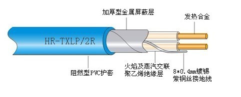 它結(jié)構(gòu)包括有:護套:藍色聚氯乙烯( PVC ); 接地線:鍍錫銅絲; 屏蔽層:鋁箔 + 銅絲; 內(nèi)導體:合金電阻絲+銅絲; 內(nèi)絕緣:交聯(lián)聚乙烯( XLPE );