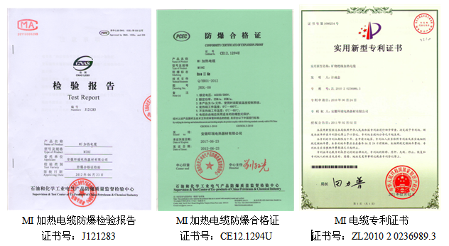 安徽環(huán)瑞MI發(fā)熱電纜獲得了國家專利證書及石油化工協(xié)會(huì)頒發(fā)的防爆合格證.