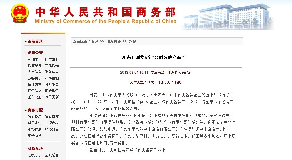 熱烈祝賀環(huán)瑞憑借自限溫電伴熱榮獲合肥名牌產(chǎn)品榮譽(yù)稱號(hào),以下為中華人民共和國商務(wù)部轉(zhuǎn)載新聞,內(nèi)容如下: