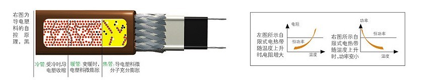 在每根伴熱線內,母線之間的電路數(shù)隨溫度的影響而變化,當伴熱線周圍的溫度變冷時,導電塑料產生微分子的收縮而使碳粒連接形成電路,電流流經(jīng)這些電路,使伴熱線發(fā)熱。