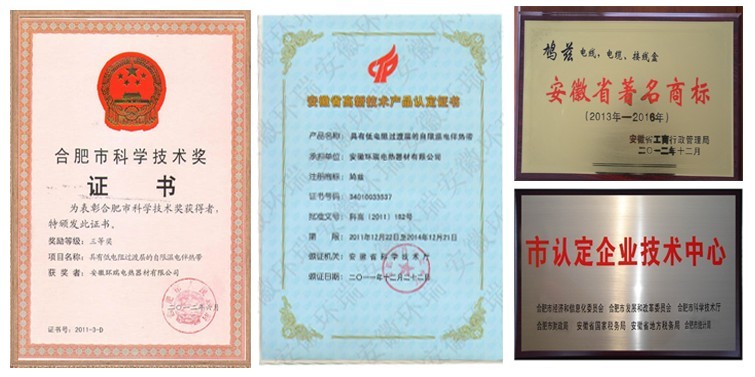 安徽環(huán)瑞擁有21項自主知識產權,其中包括:2項國家發(fā)明專利;4項新型電伴熱帶、發(fā)熱電纜生產核心技術(1、雙層共擠技術,2、束代絞預恒張力絞線,3、一體化熱線冷線隱式拼接,4、三層共擠技術);5項核心新型產品(1、具有低電阻過渡層的電伴熱帶,2、一種安全塑料體的電伴熱帶,3耐高溫耐磨的發(fā)熱電纜,4、太陽能熱利用電伴熱帶,5、新型長距離并聯(lián)、串聯(lián)恒功率電熱帶);10項行業(yè)專用電伴熱帶(消防專用電伴熱帶、電廠煙氣脫硫專用電熱帶、太陽能熱水器本質安全型電熱帶、石油管道伴熱專用電熱帶、汗蒸房專用電熱帶、天溝融雪專用發(fā)熱電纜、混凝土養(yǎng)護專用發(fā)熱電纜、畜牧養(yǎng)殖專用發(fā)熱電纜等)。安徽環(huán)瑞憑借此項榮譽獲得了省科學技術獎、高新技術產品證書及國家地暖行業(yè)、省建設廳榮譽推廣證書。