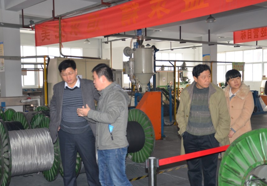 縣委孫書記、開發(fā)區(qū)領(lǐng)導(dǎo)仔細聆聽計總介紹關(guān)于我司自限溫電熱帶,恒功率電伴熱帶生產(chǎn)工藝流程
