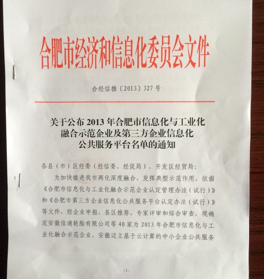 以下為合肥市經(jīng)濟(jì)和信息化委員會頒發(fā)證書及紅頭文件: