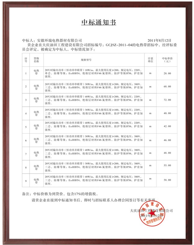 喜報!安徽環(huán)瑞在總公司領(lǐng)導(dǎo)的關(guān)懷下、在以優(yōu)秀經(jīng)理徐紅兵同志為帶領(lǐng)的大慶辦事處全體員工的辛勞下,經(jīng)過不懈努力,在與全國各地20余家同行業(yè)企業(yè)的競爭中,脫穎而出,于2011年7月30號拔得頭籌,中標(biāo)成功!成為大慶油田建設(shè)集團(tuán)卓越中標(biāo)單位、大慶油田石油管理局入網(wǎng)單位!