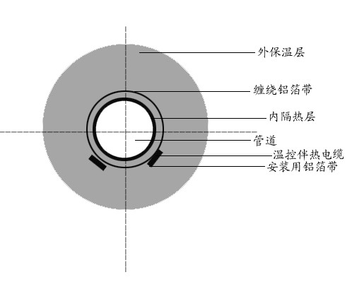 由于蒸汽掃線時(shí)間相對(duì)較短。一般控制在30分鐘左右??刹捎孟聢D雙層保溫結(jié)構(gòu)來保證使用。一般來說,這種結(jié)構(gòu)的內(nèi)層保溫厚度為5-10mm.在內(nèi)保溫層外加包鋁膠帶,鋁膠帶上敷設(shè)自控溫電熱帶。每毫米內(nèi)層保溫層可使掃線溫度減低10℃左右,或采用隔離支架,每米1—2只,效果也較理想。當(dāng)然,在掃線時(shí)必須停止通電,管線熱損失仍按常規(guī)設(shè)計(jì),保溫層厚度只能按外層為計(jì)算厚度。