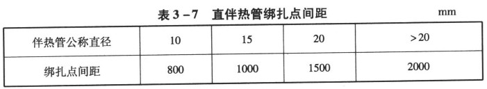 伴熱管應(yīng)與主管平行安裝,并應(yīng)自行排液。當(dāng)一根主管需要多根伴熱管伴熱時(shí),伴熱管之間的距離應(yīng)固定。水平伴熱管宜安裝在主管下方或靠近支架的側(cè)面,鉛垂伴熱管應(yīng)均勻分布在主管周圍,不得將伴熱管直接點(diǎn)焊在主管上,而可采用綁扎帶或鍍鋅鐵絲等固定在主管上。彎頭部位的伴熱管綁扎帶不得少于3道,直伴熱管綁扎點(diǎn)間距應(yīng)符合表3一7的規(guī)定。