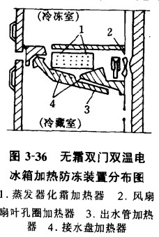 加熱防凍裝置中的出水管加熱器處于經(jīng)常加熱狀態(tài),接水盤(pán)加熱器和風(fēng)扇扇葉孔圈加熱器則僅在蒸發(fā)器加熱化霜時(shí)才工作。接水盤(pán)加熱器裝置在接水盤(pán)的外表面,其作用是防止霜水滴人接水盤(pán)內(nèi)凍結(jié)積累而損壞周?chē)Y(jié)構(gòu)。裝置出水管加熱器的目的是防止霜水導(dǎo)出箱外時(shí)發(fā)生“冰堵”,造成霜水滋出盤(pán)外,淋濕并污染食品。風(fēng)扇扇葉孔圈加熱器裝置在風(fēng)扇扇葉孔圈部位,在對(duì)蒸發(fā)器加熱化霜時(shí)它對(duì)扇葉孔圈部位加熱,防止該部位因凝霜過(guò)厚而將扇葉卡住,造成箱內(nèi)冷風(fēng)的正常循環(huán)中斷,甚至燒毀風(fēng)扇電機(jī)。