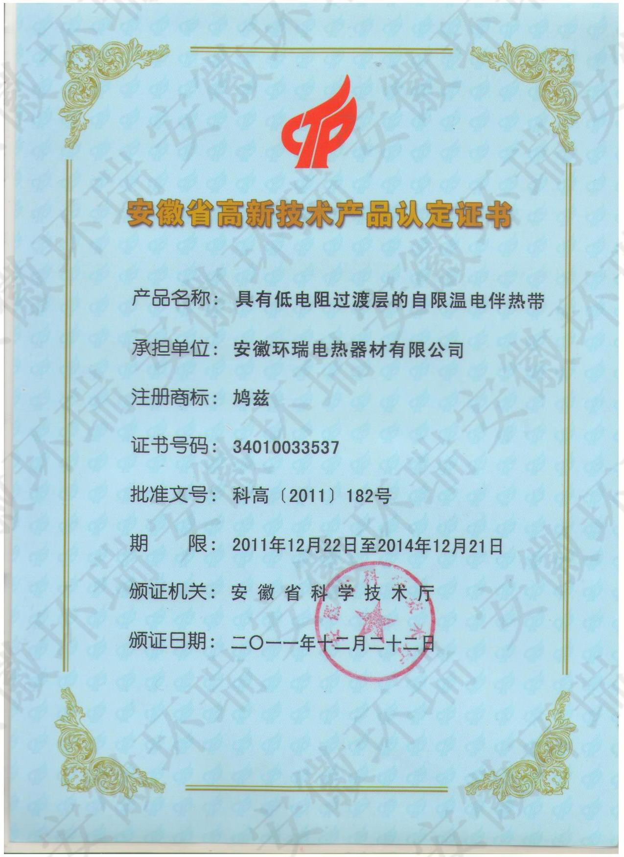 【喜訊】熱烈慶祝安徽環(huán)瑞公司獲省科技廳電熱帶高新技術(shù)產(chǎn)品
