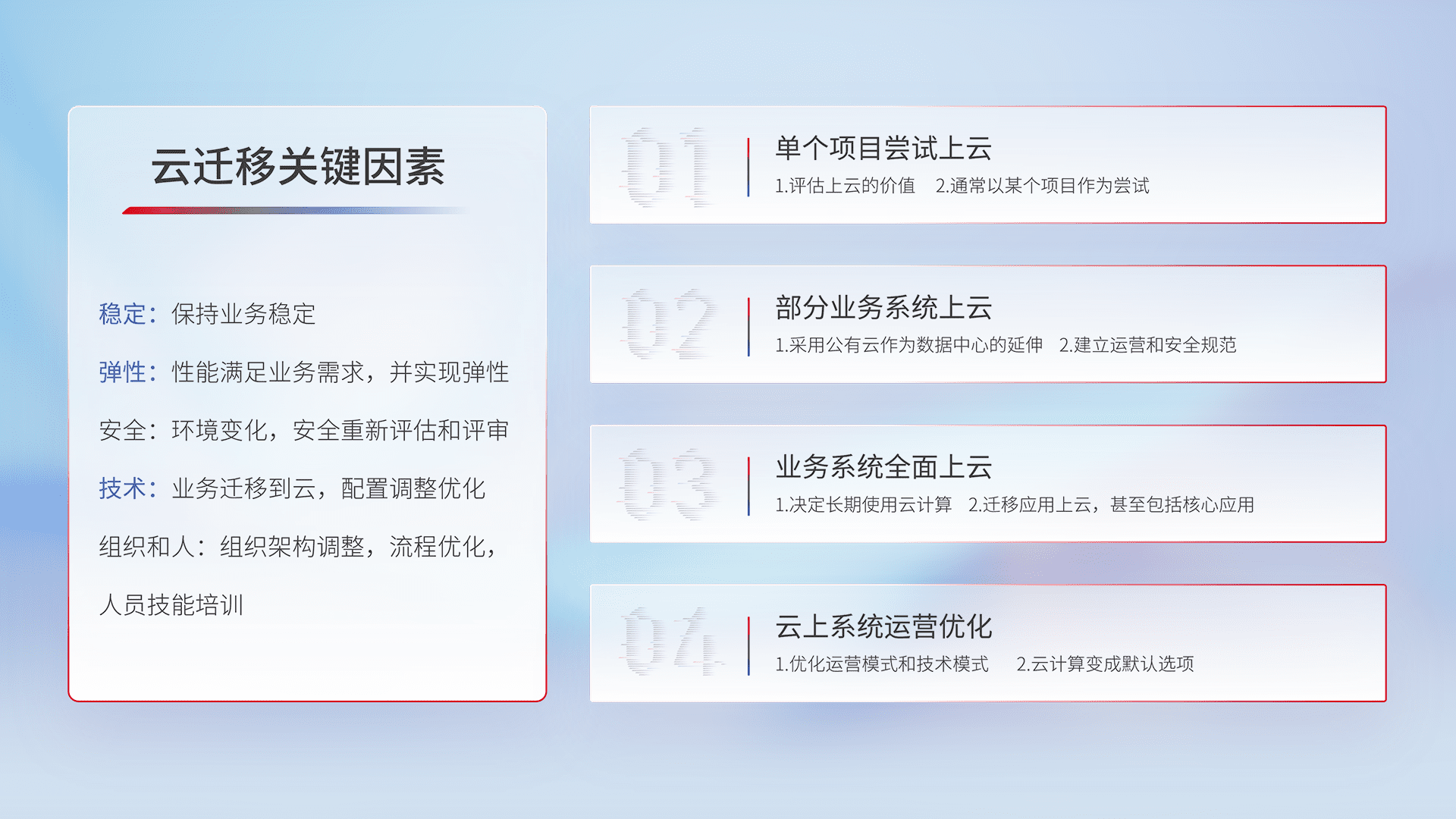 结合实际业务,,,,从规划设计、、、云平台选型、、、、云原生改造、、、、数据迁移、、、、集成交付,,,,迁移全过程为客户识别最佳上云路径,,,做好风险识别管理,,,,设计网络架构、、身份权限、、、、安全审计合规、、、操作审计、、、日志审计、、、、监控告警策略、、多站点容灾设计等,,,对云上基础设施进行整体规划,,提升IT治理水平,,,,以满足弹性、、、、高可用、、、高性能的需求。。。。